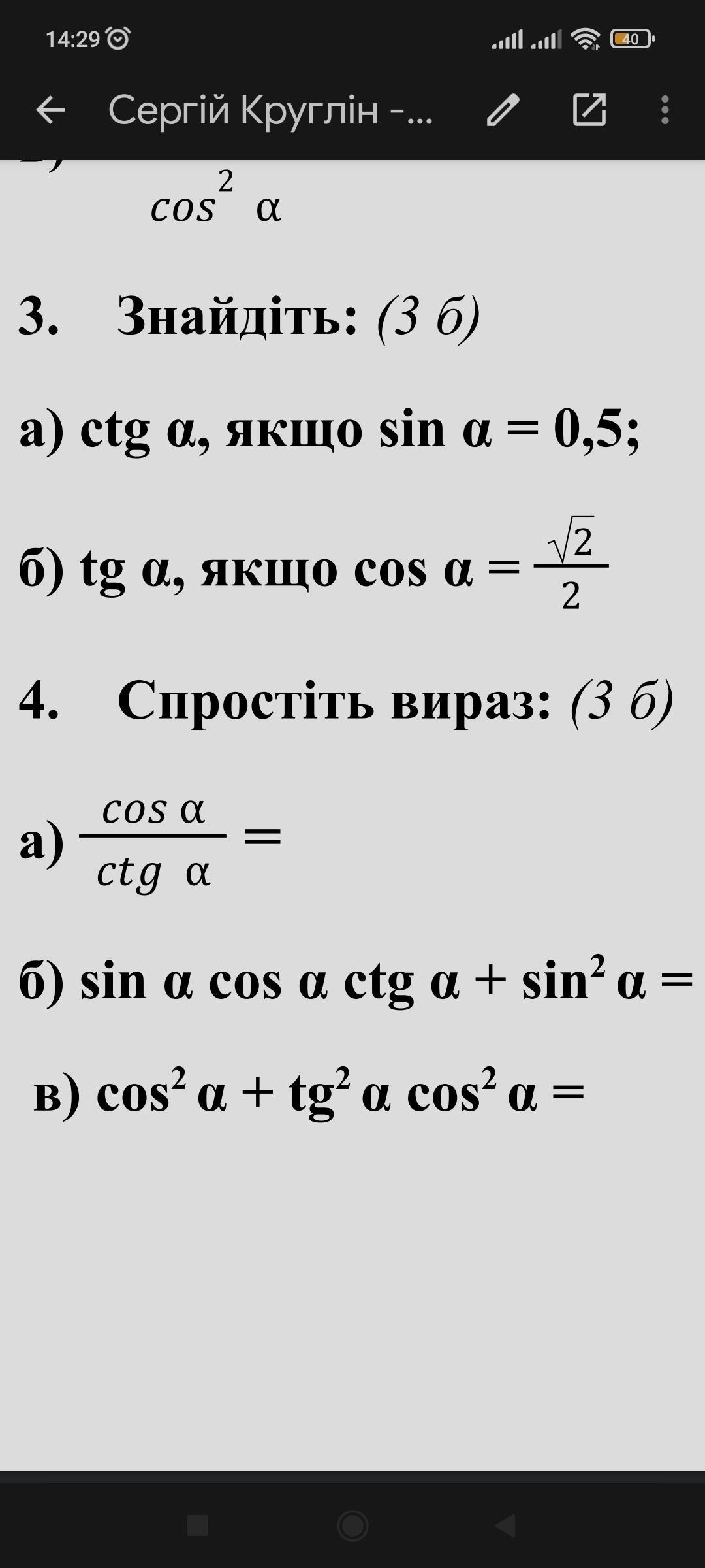 4. а) cosα/ctgα = cosα/cosα/sinα = cosα·sinα/cosα = sinα.