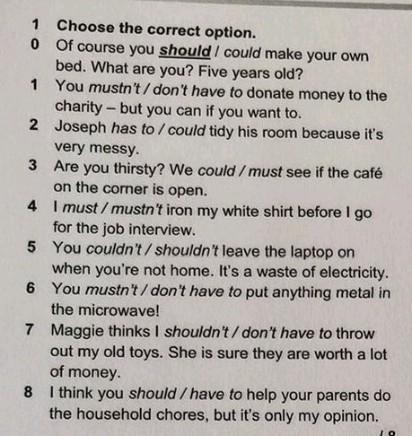 sholdn't;can;should;couldn't;don't have to;can't;can;could.