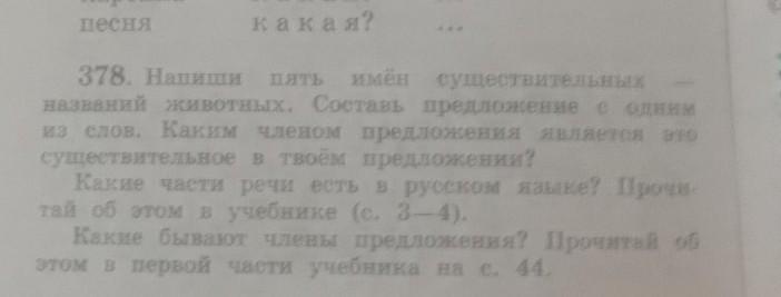 378. Напиши пять имён существительных названий животных. Составь предложение с одним из слов. Каким членом предложения является это существительное в твоём предложении? Какие части речи есть в русском языке? Прочи- тай об этом в учебнике (с. 3-4). Какие бывают члены предложения? Прочитай об этом в первой части учебника на с. 44.