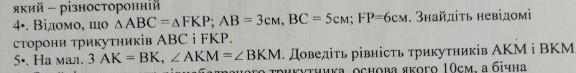 Відомо, що ∆ABC = FKP; AB = 3см, ВС=5см; FP-6см. Знайдіть невідомі сторони трикутників ABC i FKP.