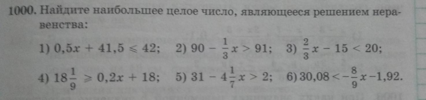 1000. Найдите наибольшее целое число, являющееся решением нера- венства: 1) 0,5x + 41,5 < 42; 4) 18 > 0,2x + 18; 9 10 1 2 2) 90 – *>91; 3) x-15 < 20; 3 3 5) 31 - 4x>2; 6) 30,08