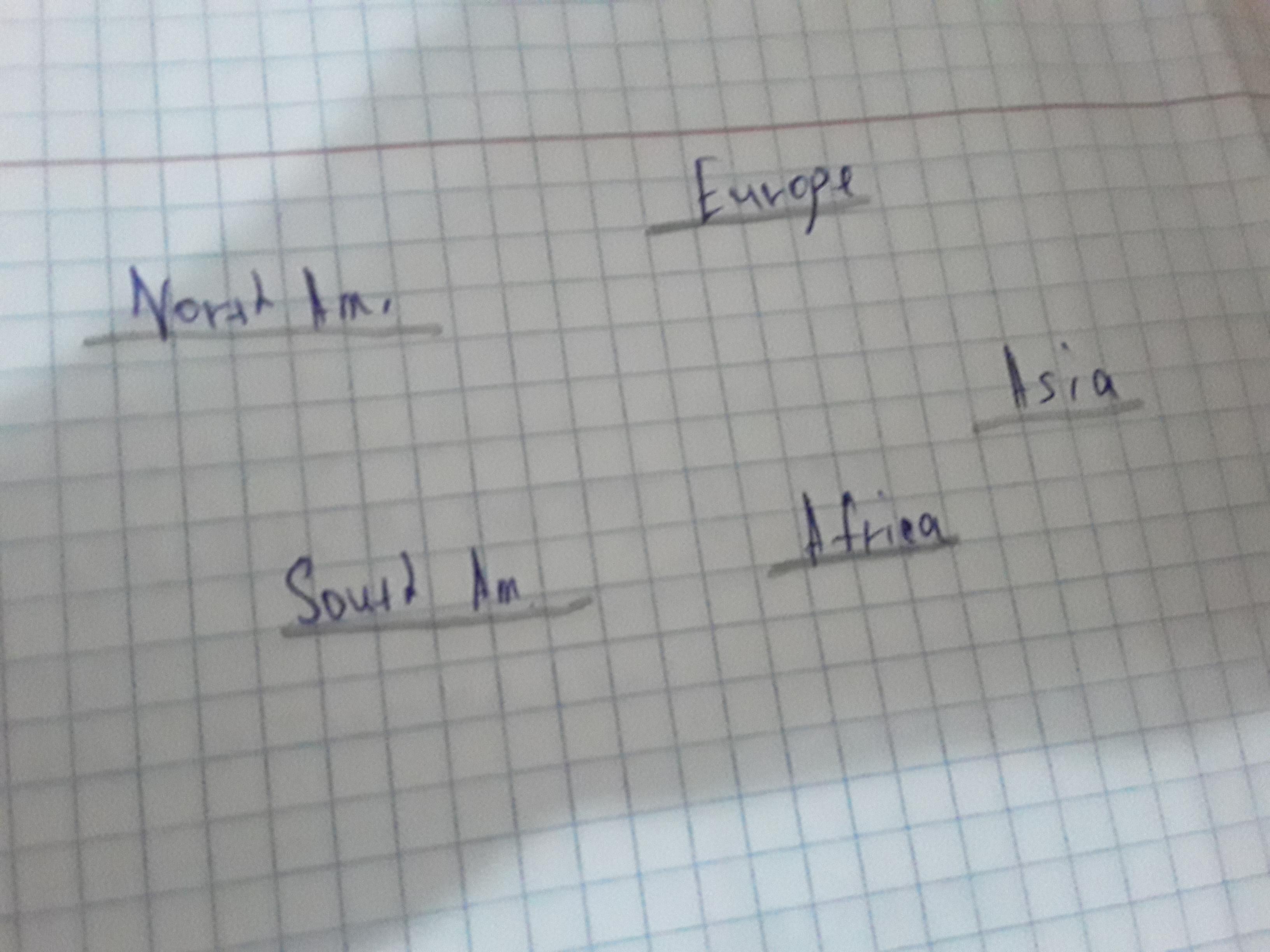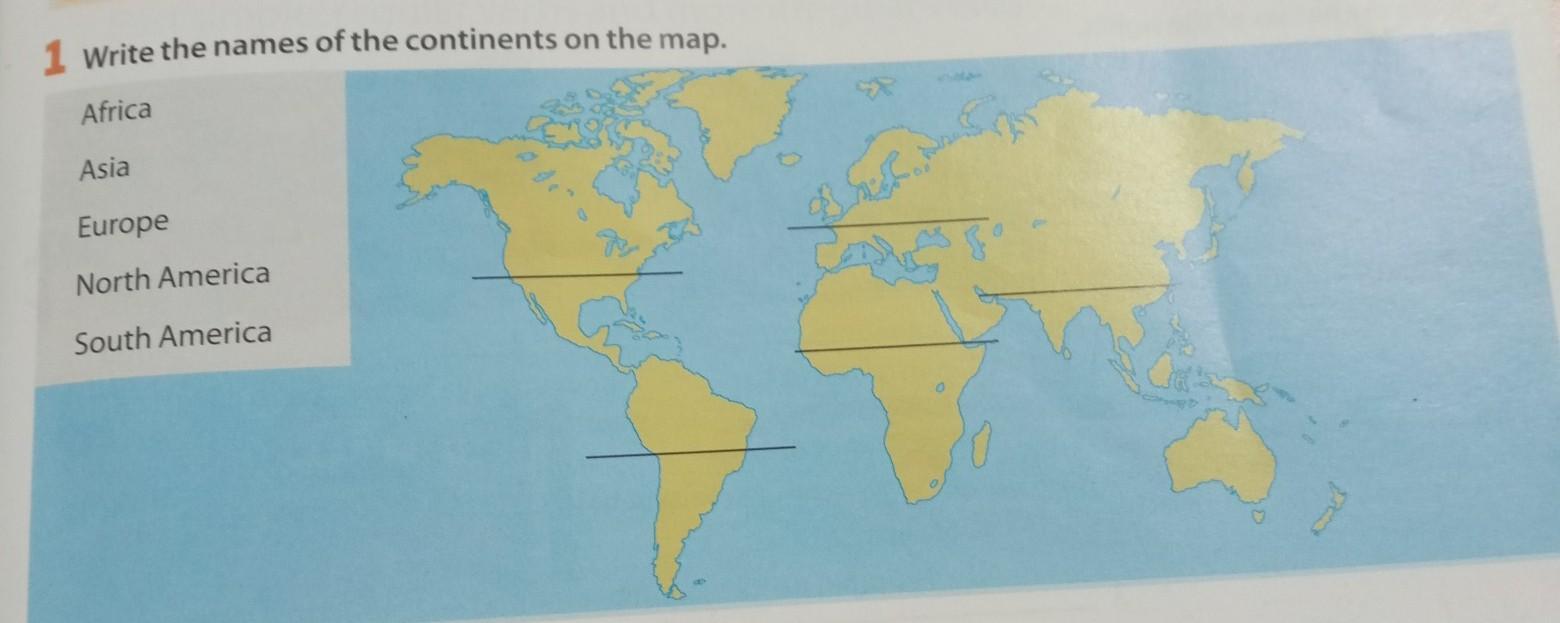 1 Write the names of the continents on the map. Africa Asia Europe North America South America