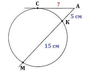 Через точку А до кола проведено дотичну АС(С-точка дотику) і пряму, яка перетинає коло в точках К і М. Знайти АС, якщо АК=5 см, МК=15см.