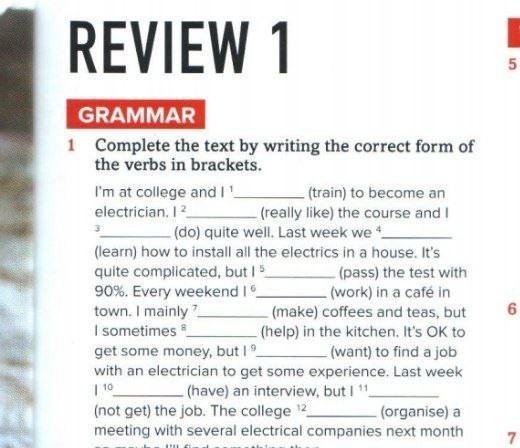 1 Complete the text by writing the correct form of the verbs in brackets. I'm at college and I1¹_ electrician. 12 (train) to become an (really like) the course and I (do) quite well. Last week we (learn) how to install all the electrics in a house. It's quite complicated, but 15 90%. Every weekend 16 (pass) the test with -(work) in a café in (make) coffees and teas, but (help) in the kitchen. It's OK to (want) to find a job get some money, but 19. with an electrician to get some experience. Last week | 10 (have) an interview, but I ¹¹_ (not get) the job. The college ¹2 meeting with several electrical companies next month so maybe I'll find something then. (organise) a town. I mainly I sometimes