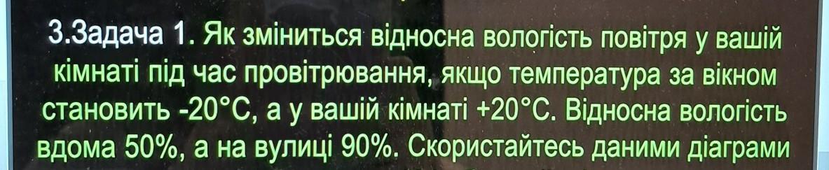 3.Задача 1. Як зміниться відносна вологість повітря у вашій кімнаті під час провітрювання, якщо температура за вікном становить -20°С, а у вашій кімнаті +20°С. Відносна вологість вдома 50%, а на вулицi 90% хелпп