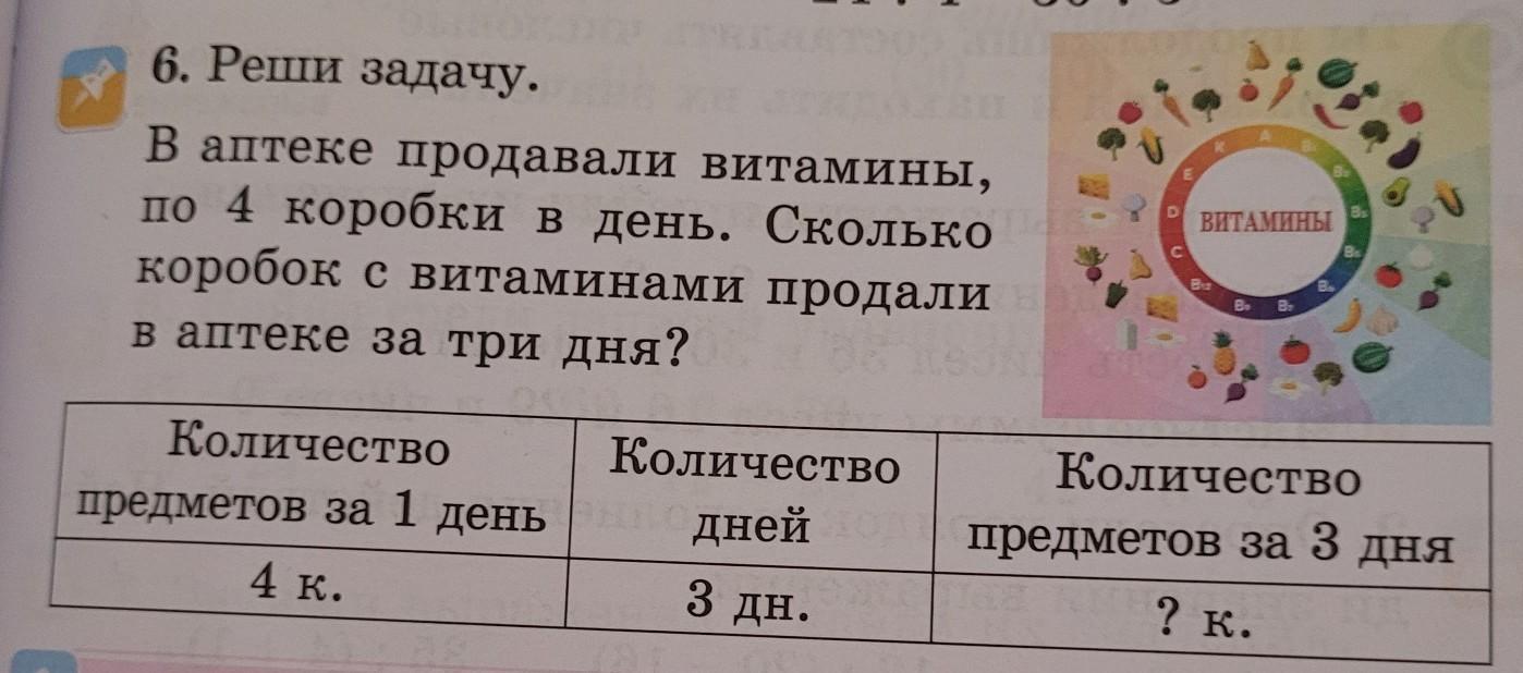 6. Реши задачу. В аптеке продавали витамины, по 4 коробки в день. Сколько коробок с витаминами продали в аптеке за три дня? Количество предметов за 1 день 4 к. Количество дней 3 дн. ВИТАМИНЫ Количество предметов за 3 дня ? к.