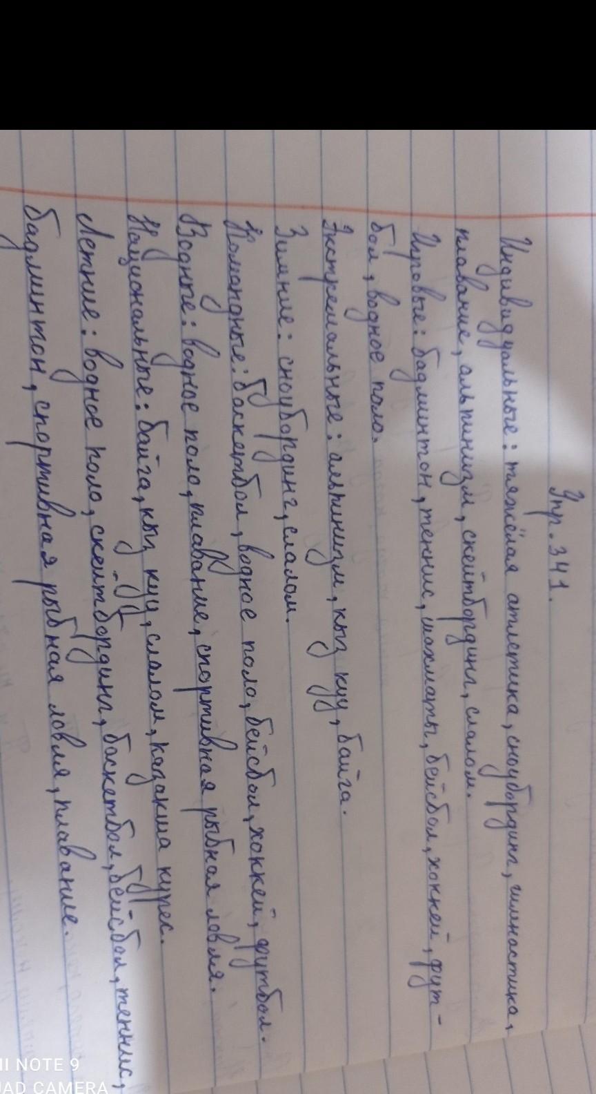 341. Прочитайте слова в рамке, запишите их в таблицу в упражнении 340 по группам, обозначающим виды спорта. Одно и то же слово может попасть в две группы. Как вы думаете, по- чему? Назовите среди них самые популярные виды спорта. бадминтон • теннис • шахматы • баскетбол ⚫ скейтбординг • • водное поло • байга • тяжелая атлетика • кыз куу • сноубординг • спортивная рыбная ловля • гимнастика • бейсбол • слалом • Хоккей • Футбол • плавание • • казакша курес • альпинизм •