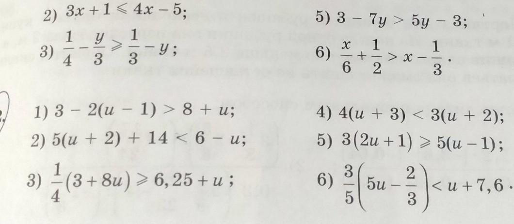 952, 1) 3 - 2(u - 1) > 8 + u; 2) 5(u + 2) + 14 < 6 - u; 3) 1 (3 +8u) > 6,25+u ; 4 4) 4(u + 3) < 3(u + 2); 5) 3 (2u+1) > 5(u-1);