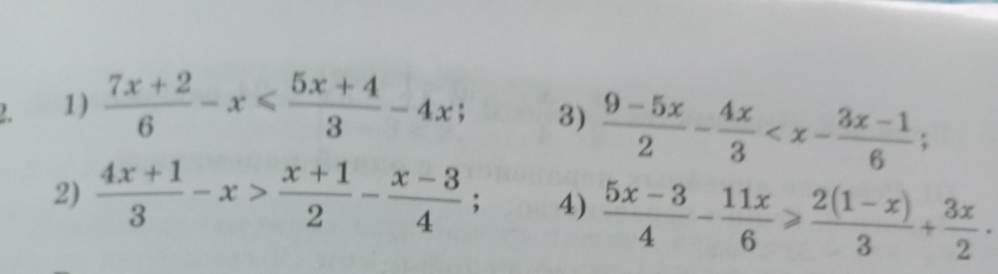 1) 2) 7x+2 6 4x+1 3 1 - X > ox+4 3 x+1 +2 WI 4x; x-3 4 ; 3) 4) 9-5x 4x 2 3 11x 6 5x-3 4 3x-1 6 2(1-x) 3 4 3x