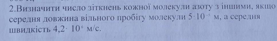 Помогите, прошу вас!!! Фізика. Оформити як задачу (дано, знайти, фізична формула, робоча формула, рішення, відповідь). Визначити число зіткнень кожної молекули азоту з іншими, якщо середня довжина вільного пробігу молекули 5*10^-5 м, а середня швидкість 4,2*10^6 м/с.