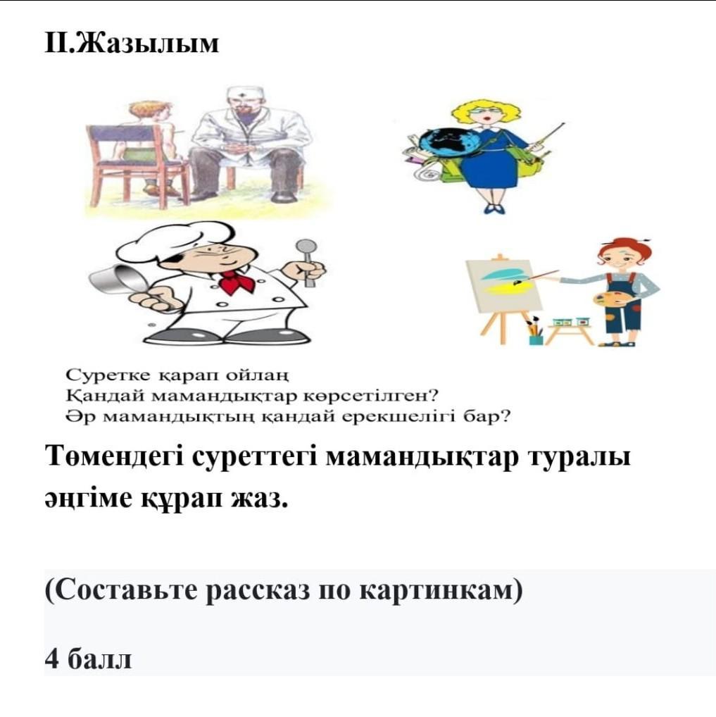 Менің анам – педиатр. Ол жұмысқа таңертең ерте шығып, түнде қайтады. Күн сайын балаларды қарап, өкпесі мен жүрегін тыңдап, тамағына қарап, дене қызуын өлшейді. Олар оған жақында туылған ең кішкентай балаларымен бірге келеді. Анам олардың қалай өсіп жатқанын бақылайды, салмағы қанша, қалай дамып, не үйренетінін тексереді. Бұл нәресте кенеттен ауырып қалса, уақытында көмектесу үшін қажет. Дәрігер – ең маңызды мамандықтардың бірі, себебі дәрігерлер адамдарды емдейді және көптеген өмірді сақтайды. Әрбір бала өзін нашар сезініп, бірдеңе ауырса, дәрігер міндетті түрде көмектесетінін біледі. Дәрігерлер әртүрлі - кейбіреулер балаларды емдейді, басқалары ересектерді емдейді. Кейбіреулер тістерді емдейді, басқалары құлақты, тамақ пен мұрынды емдейді, басқалары жүректі емдейді. Неше түрлі дәрігерлер бар және олардың барлығының бір міндеті бар - адамға қалпына келтіруге көмектесу. Дәрігерлер біздің денсаулығымызды ойлайды.