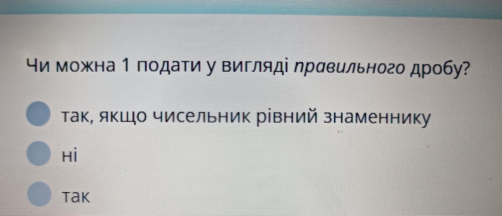 Чи можна 1 подати у вигляді правильного дробу? так, якщо чисельник рівний знаменнику.
