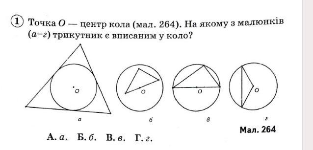 тест 1) Точка О центр кола (мал. 264). На якому з малюнків (a-г) трикутник е вписаним у коло?