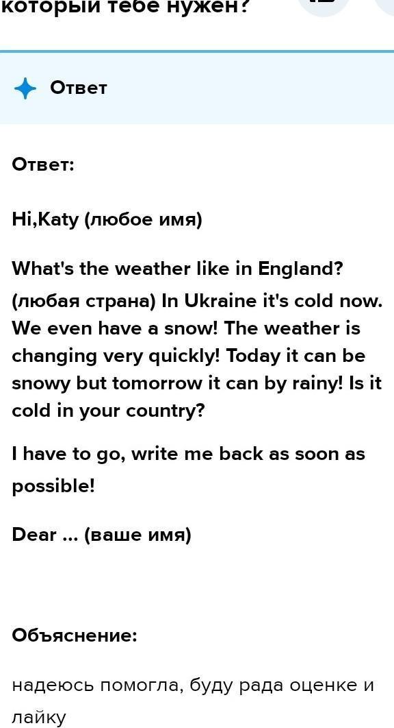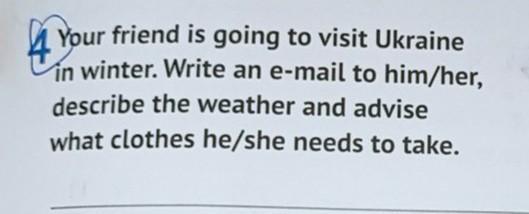 Hi! (friend's name), I heared, that you want to visit Ukraine in winter. Let me advise you, what clothes you need to take in journey. A good place in our country is Carpathian mountains. If you want to go there, I advise you to take warm things, like jacket, trousers, scarf, boots and hat. But if you want to go to the city - here the temperature is about 3-4 degrees.