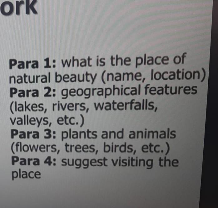 Para 1: what is the place of natural beauty (name, location) Para 2: geographical features (lakes, rivers, waterfalls, valleys, etc.) Para 3: plants and animals (flowers, trees, birds, etc.) Para 4: suggest visiting the place