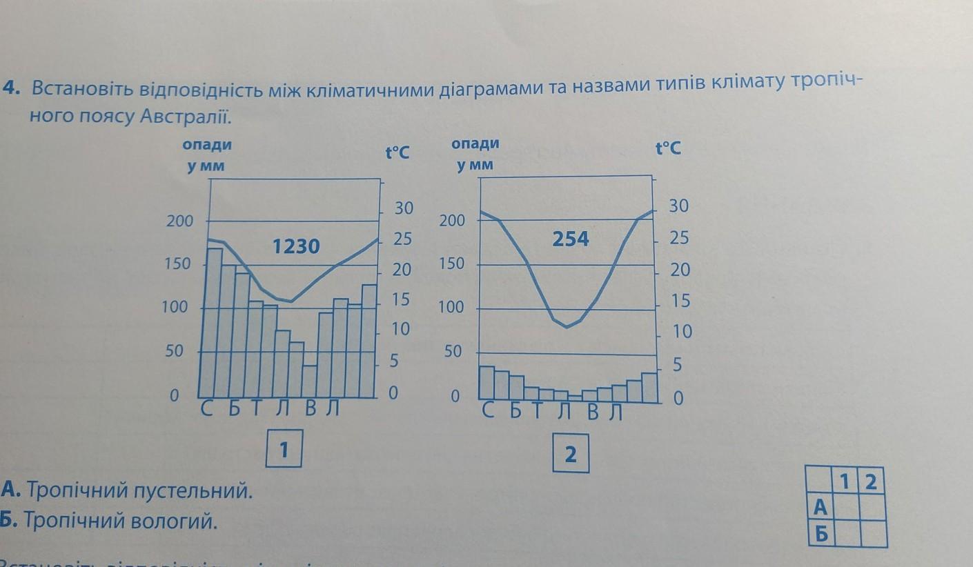 4. Встановіть відповідність між кліматичними діаграмами та назвами типів клімату тропіч- ного поясу Австралії. А. Тропічний пустельний. Б. Тропічний вологий.