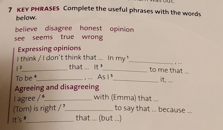 7 KEY PHRASES Complete the useful phrases with the words below. believe disagree honest opinion true wrong see seems true Expressing opinions I think / I don't think that ... In my ¹ that... It ³ 12 ... As 15 To be 4 Agreeing and disagreeing l agree/6 (Tom) is right/7_ It's 8 to me that ... it, ... with (Emma) that ... to say that ... because... that ... (but...)