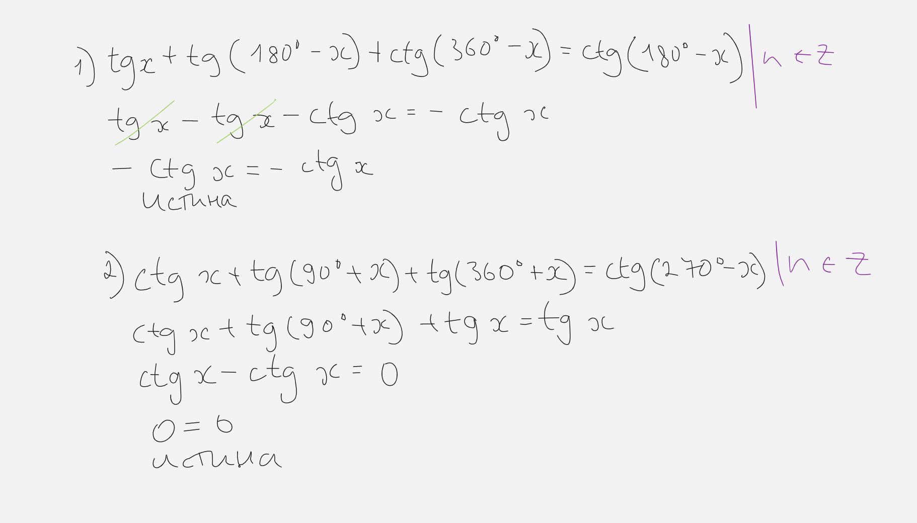 2) ctgx + tg(90° + x) + tg(360° + x) = ctg(270°- x);
