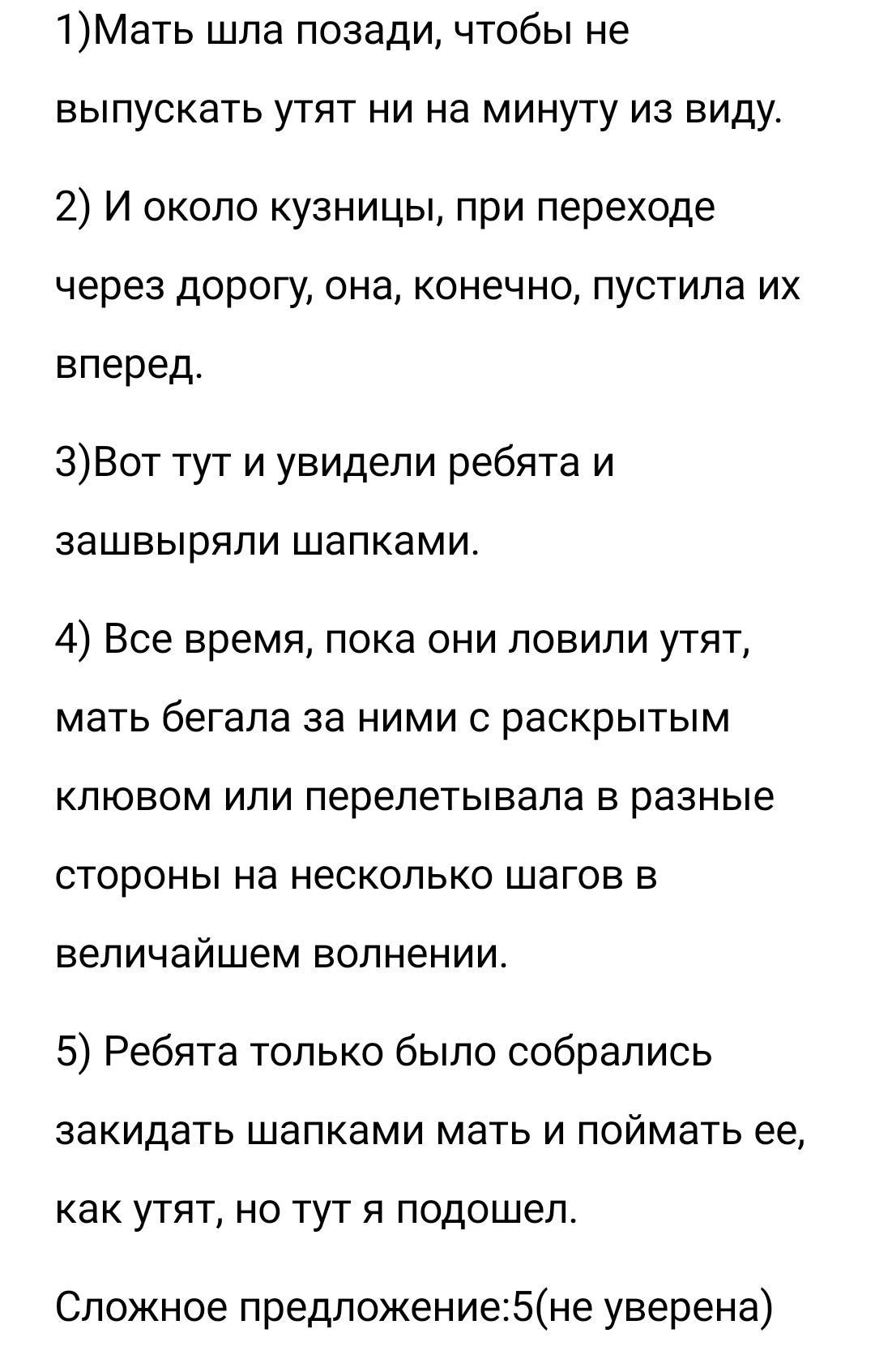 (1) Мать шла позади чтобы не выпускать утят ни на минуту из виду. (2) И около кузницы при переходе через дорогу она пустила их вперёд. (3) Вот тут их увидели ребята и зашвыряли шапками. (4) Всё время пока они ловили утят мать бегала за ними с раскрытым клювом или перелётывала в разные стороны на несколько шагов в величайшем волнении. (5) Ребята только было собрались закидать шапками мать и поймать её как утят но тут я подошёл.