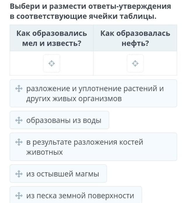 Выбери и размести ответы утверждения в соответствующие ячейки таблицы. как образовались мел и известь? Как образовалась нефть? ++ разложение и уплотнение растений и других живых организмов + образованы из воды + в результате разложения костей животных из остывшей магмы + из песка земной поверхности