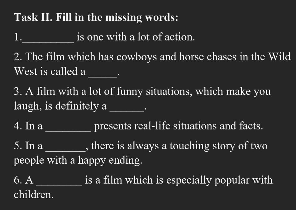 Task II. Fill in the missing words: 1. 2. The film which has cowboys and horse chases in the Wild West is called a is one with a lot of action. 3. A film with a lot of funny situations, which make you laugh, is definitely a 4. In a presents real-life situations and facts. 5. In a there is always a touching story of two people with a happy ending. is a film which is especially popular with 6. A children.
