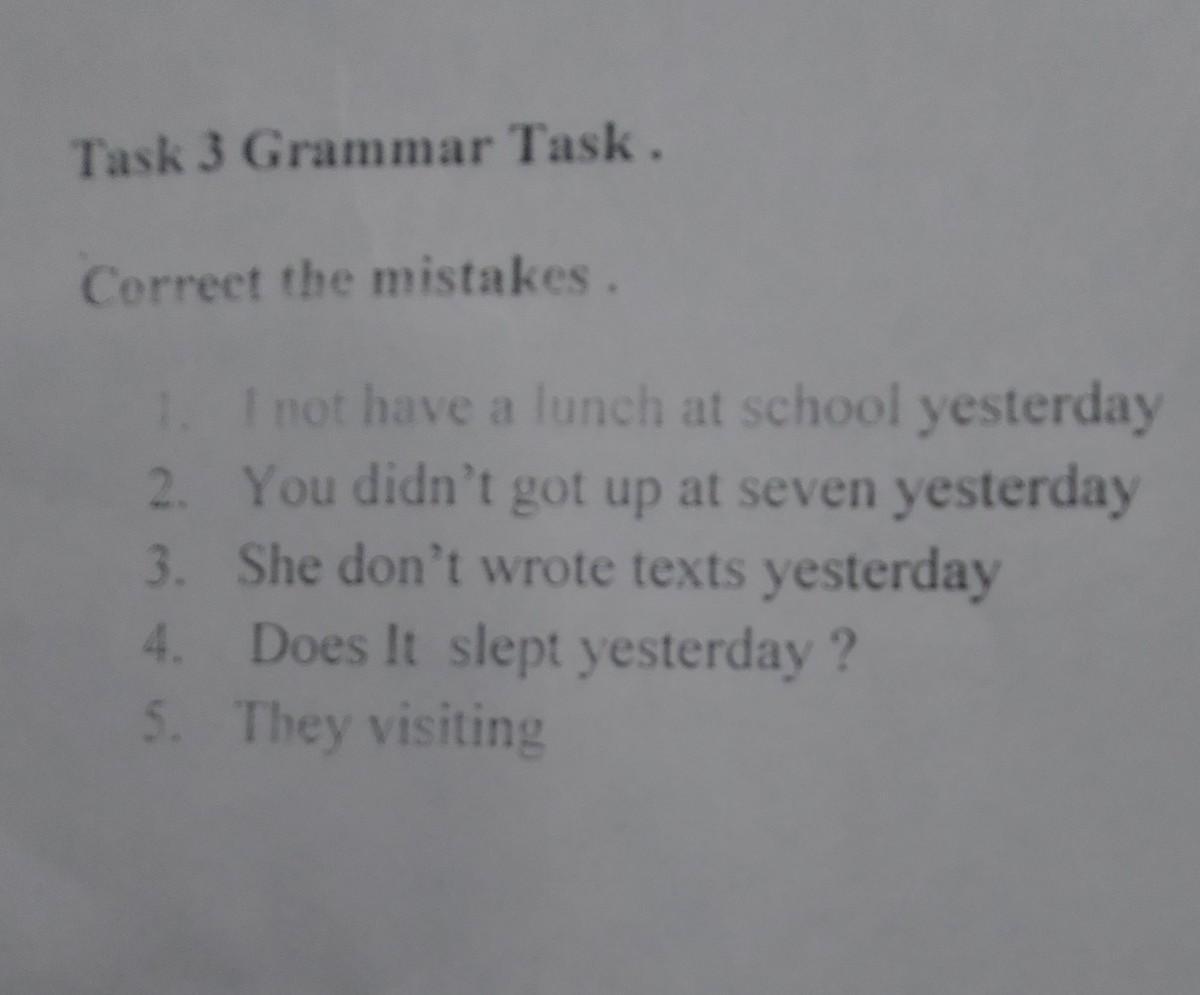 Task 3 Grammar Task. Correct the mistakes. 1. I not have a lunch at school yesterday 2. You didn't got up at seven yesterday 3. She don't wrote texts yesterday 4. Does It slept yesterday? 5. They visiting исправить ошибки