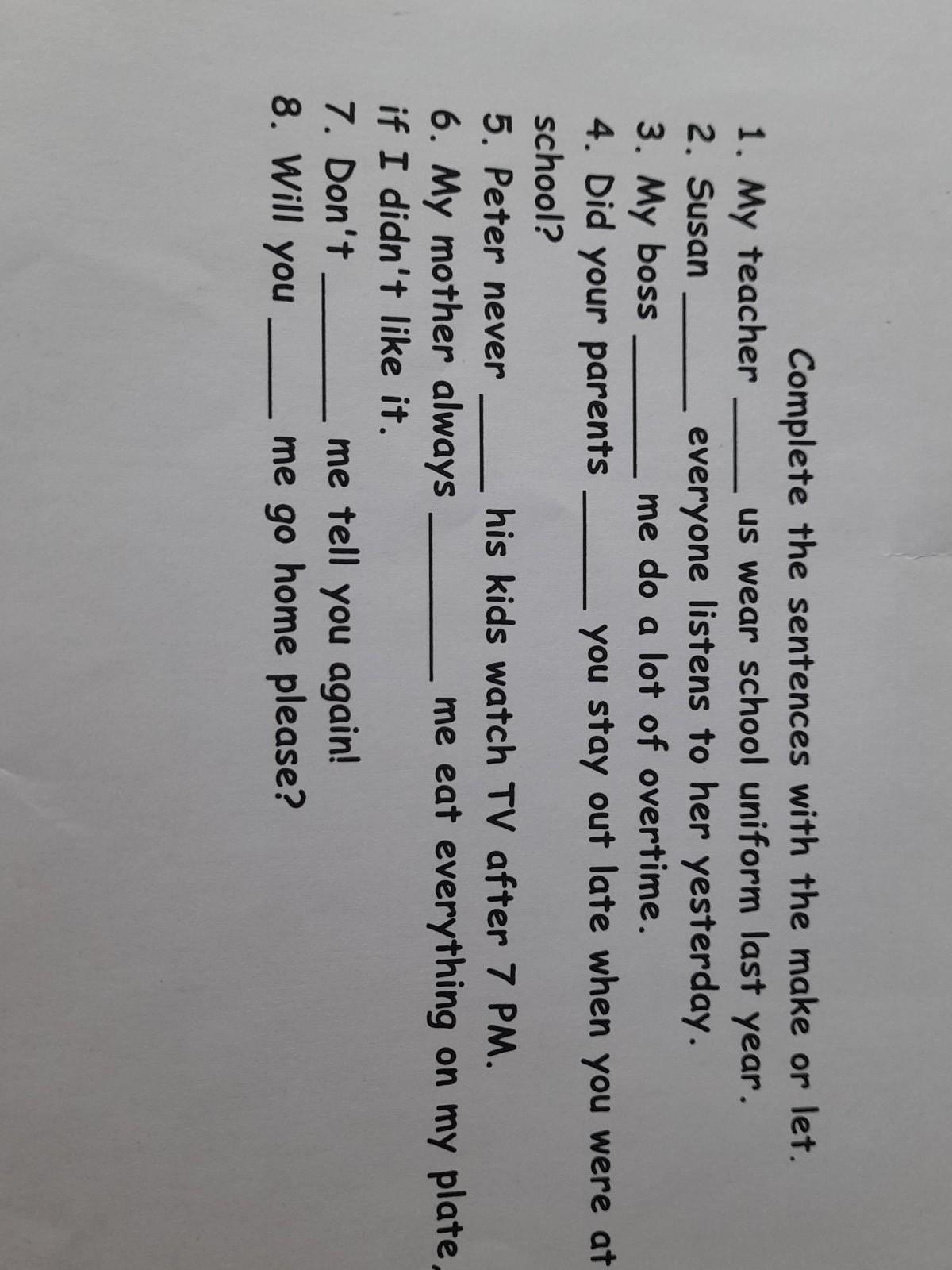 Complete the sentences with the make or let. us wear school uniform last year. everyone listens to her yesterday. me do a lot of overtime. 1. My teacher 2. Susan 3. My boss 4. Did your parents school? 5. Peter never 6. My mother always if I didn't like it. 7. Don't 8. Will you you stay out late when you were at his kids watch TV after 7 PM. me eat everything on my plate, even me tell you again! me go home please?