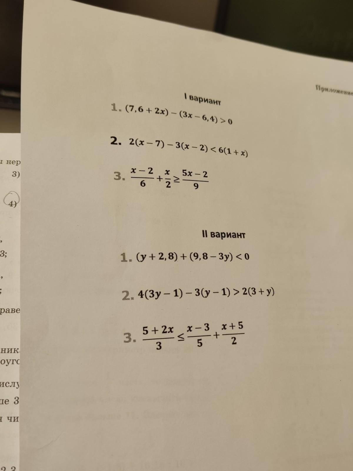 69. 1. (7,6 + 2x) – (3x − 6,4) > 0 2. 2(x-7) – 3(x − 2) < 6(1 + x) 3. x-2 6 + 2 IV 5x-2 9