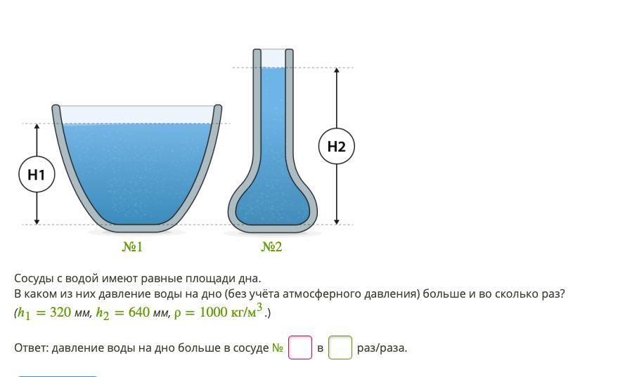 P2 / P1 = p*g*h2 / (p*g*h1) = 640/320 = 2 Раза