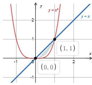 Решение. Найдём абсциссу точек пересечения линий y = x⁴ и y = x: