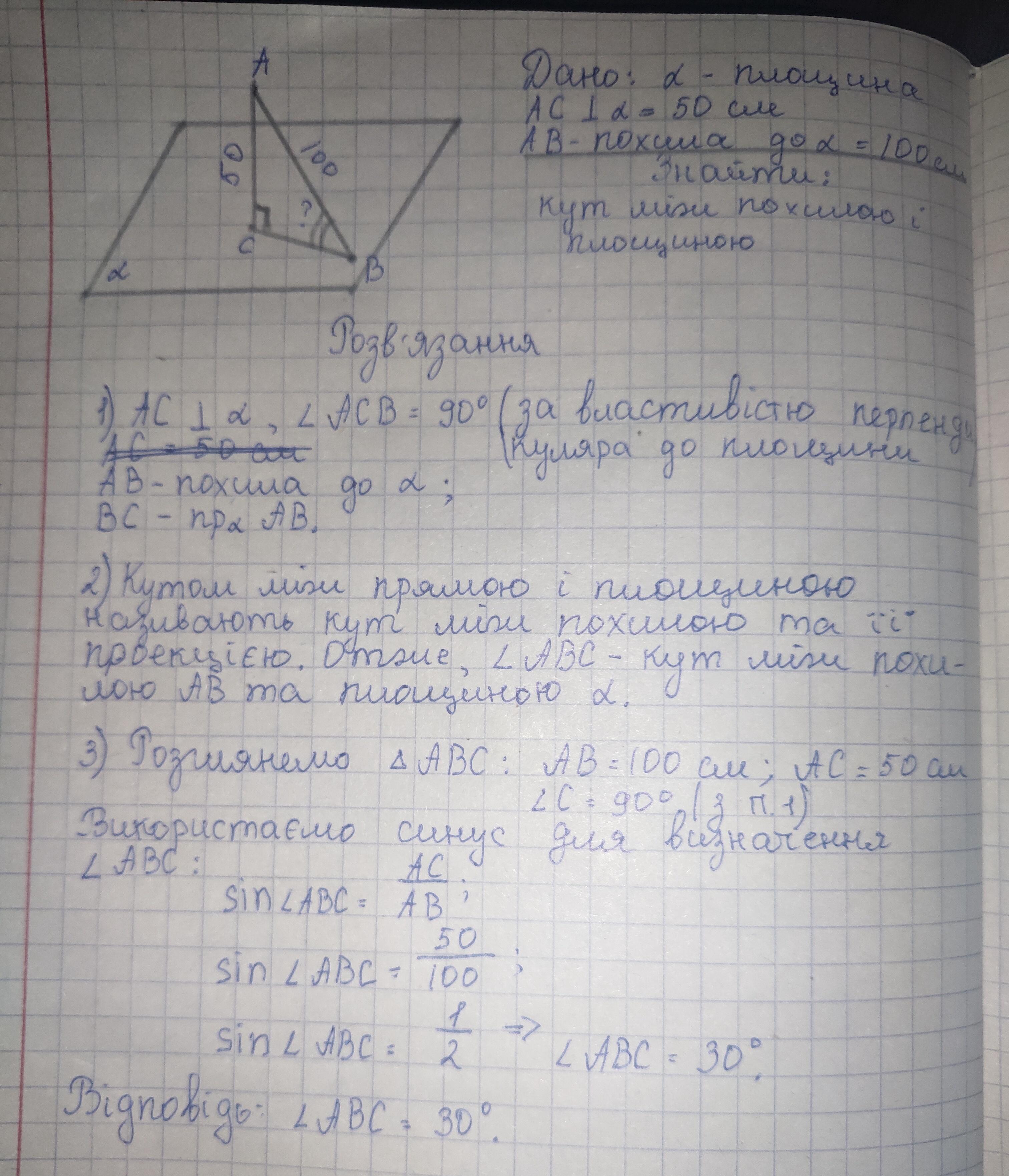 До площини проведено перпендикуляр та похилу. Довжина похилоï становить 100 см, відстань від вершини перпендикуляра до площини - 50 см.Знайди кут між похилою і площиною.