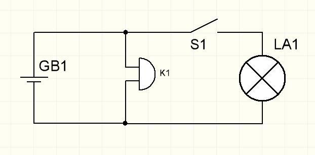 Электрический круг состоит из батарейки, лампочки, звонка и ключа. Звонок работает все время, а лампочка загорается при замыкании ключа. Нарисуйте схему, соответствующую этим условиям.