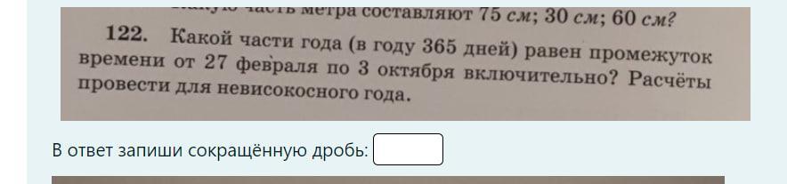 Указанный промежуток составит: 219 : 365 = (3 * 73) : (5 * 73) = 3 / 5.