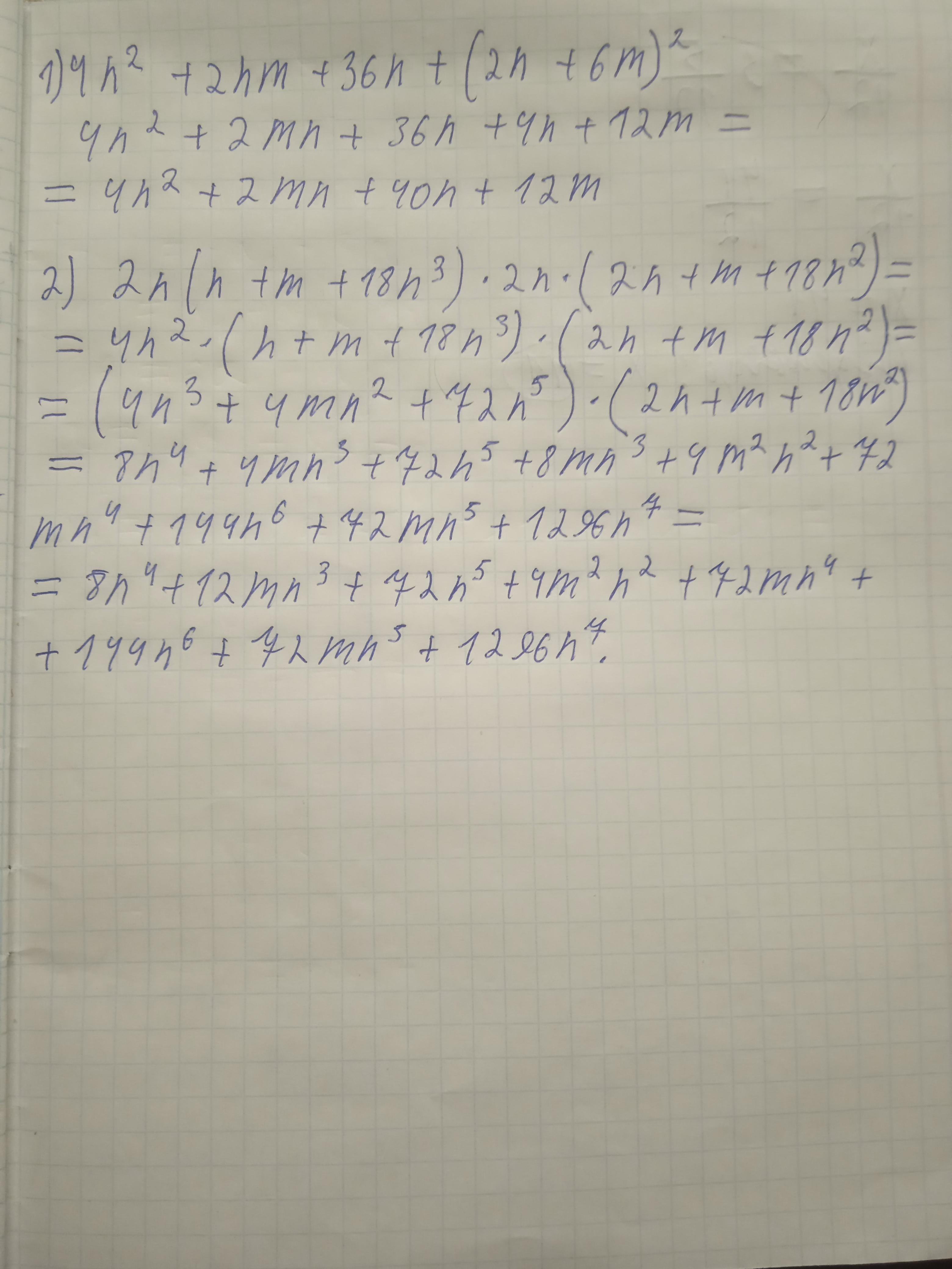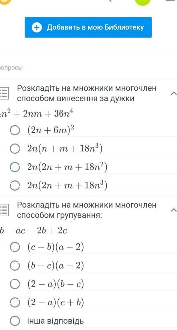 100 Розкладіть на множники многочлен способом винесення за дужки 4n² + 2nm + 36n+ (2n + 6m)2 о © 2n(n+ m + 18n³) 2n(2n + m + 18n2) О 2n(2n + m + 18n³)