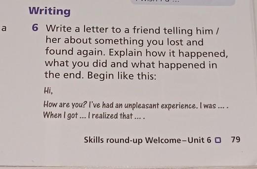 Writing 6 Write a letter to a friend telling him/ her about something you lost and found again. Explain how it happened, what you did and what happened in the end. Begin like this: Hi, How are you? I've had an unpleasant experience. I was .... When I got... I realized that ....