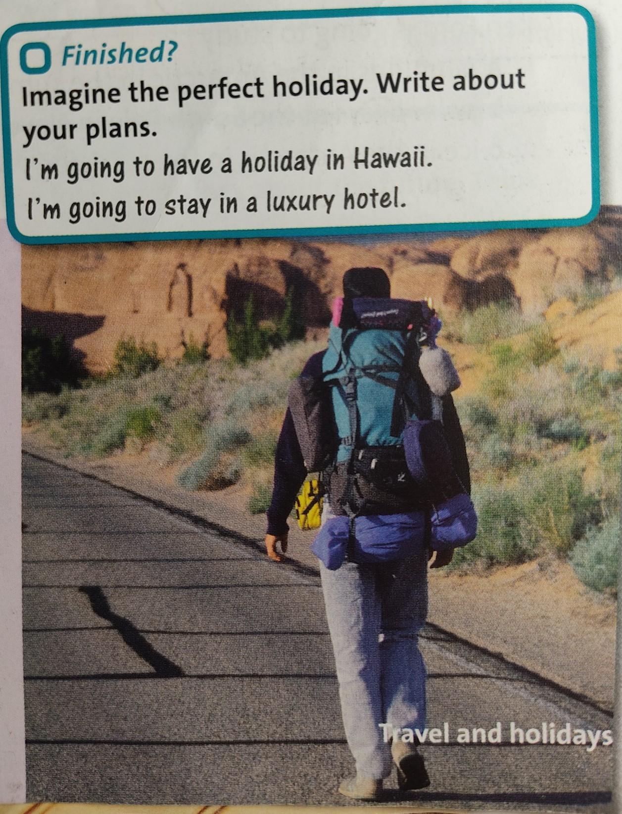 Imagine the perfect holiday. Write about your plans. I'm going to have a holiday in Hawaii. I'm going to stay in a luxury hotel. Travel and holidays