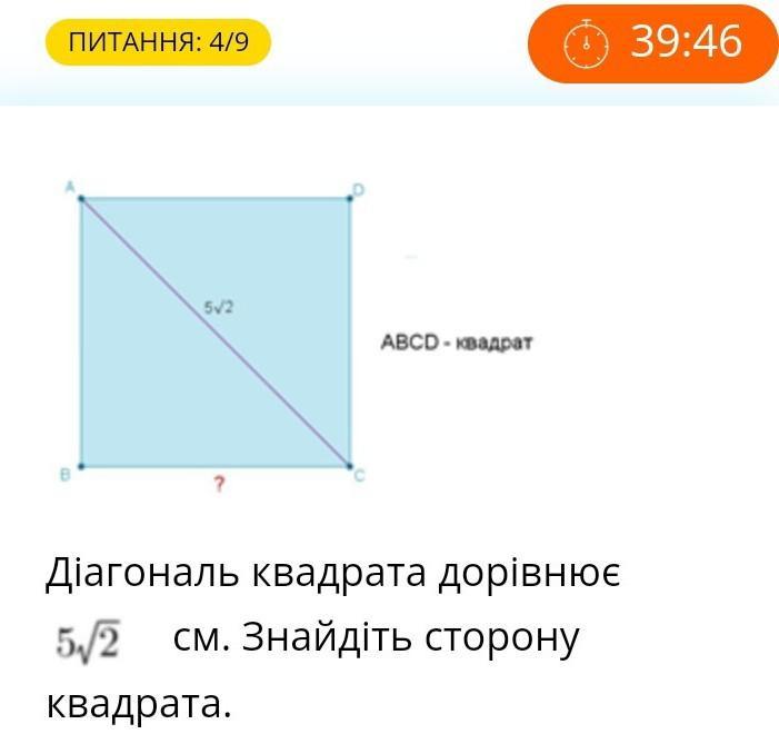 Для знаходження сторони квадрата потрібно витягти квадратний корінь з діагоналі. Сторона квадрата = діагональ / √2 Сторона квадрата = 5√2/√2
