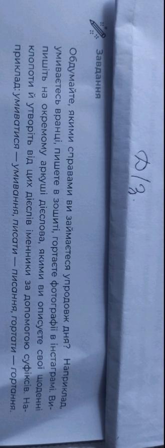 Что я делаю на протяжении дня: Встаю з ліжка; вмиваюсь вранці; снідаю; пишу в зошиті; обідаю; пишу в зошиті; відпочиваю; вмиваюсь ввечері; лягаю спати