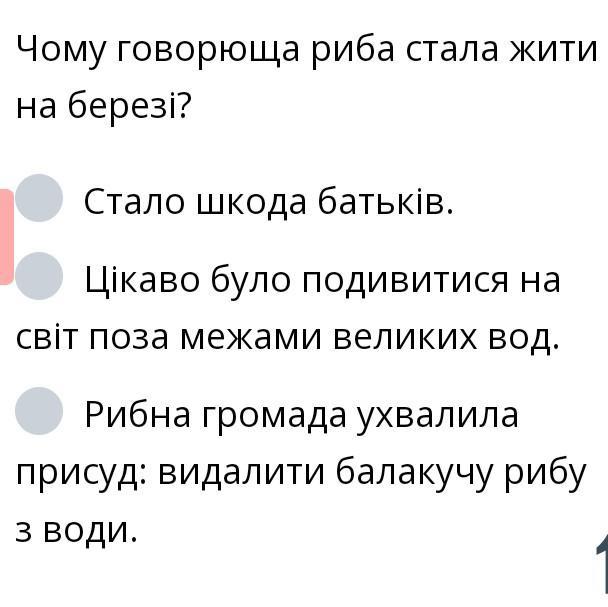 Чому говорюща риба стала жити на березі? 1.Стало шкода батьків. 2.Цікаво було подивитися на світ поза межами великих вод. 3.Рибна громада ухвалила присуд: видалити балакучу рибу з води.