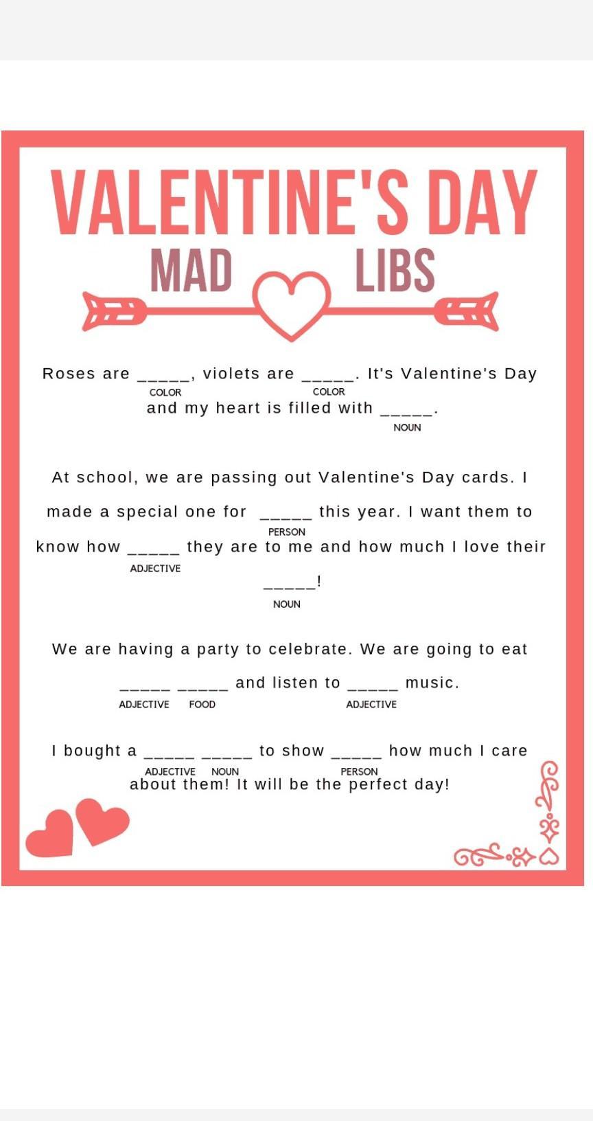 Прочитайте тексти про свято Валентина та вставити за змістом випущені слова: noun - іменник, adjective - прикметник, color - колір, person - персона/людина. Слова ви маєте вставити свої, але щоб вони відповідали змісту