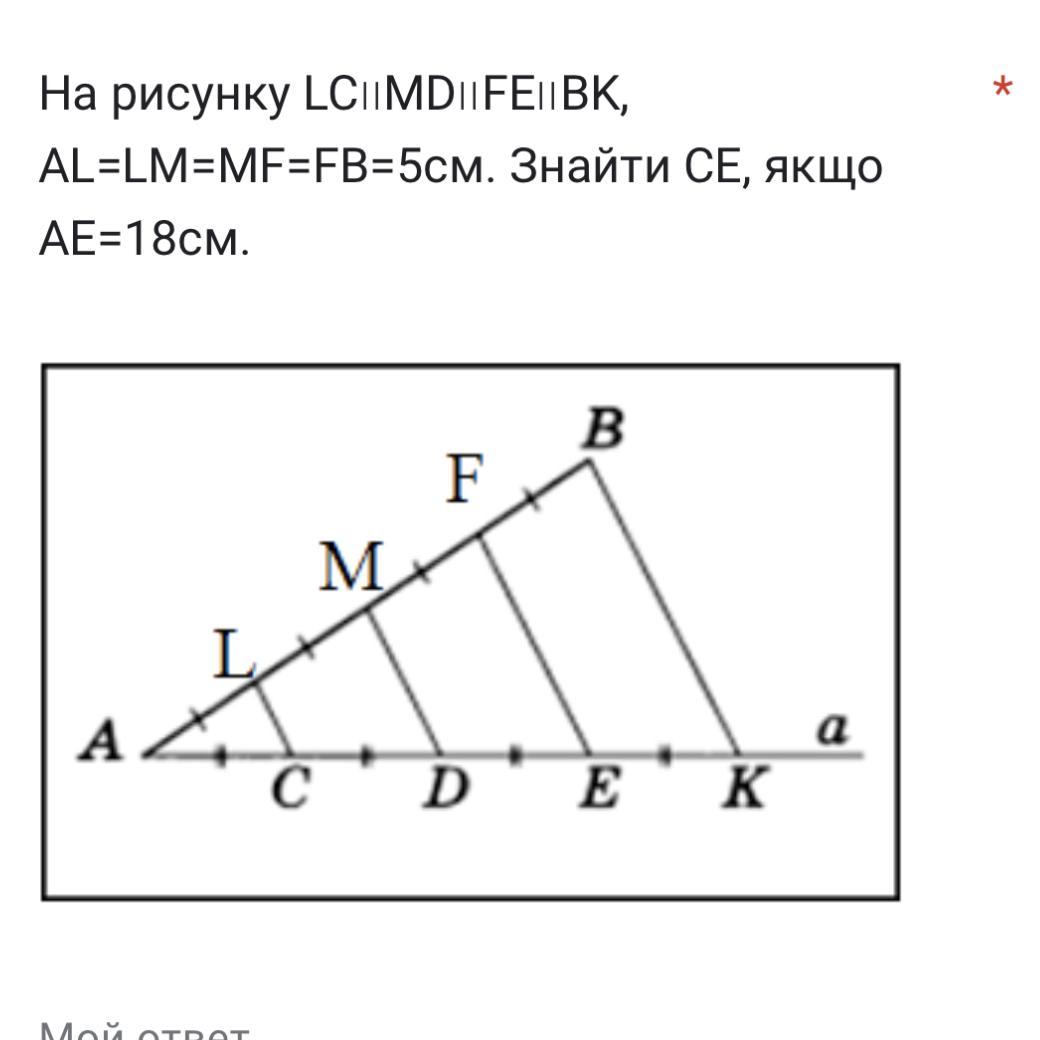 по теореме Фалеса AC=CD=DE=EK ⇒ т.к. AC+CD+DE=18см ⇒нам надо найти один из этих отрезков, а т.к. AC=CD=DE ⇒ нам надо разделить 18 на 3 ⇒AC,CD,DE,EK= 18:3 =6см ⇒от C до E 2 отрезка ⇒ CE= 6·2=12см