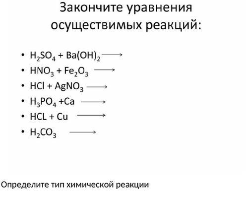 1. H2SO4+ Ba(OH)2 → 2 H2O + BaSO4 - Это кислотно-щелочная реакция (нейтрализация)