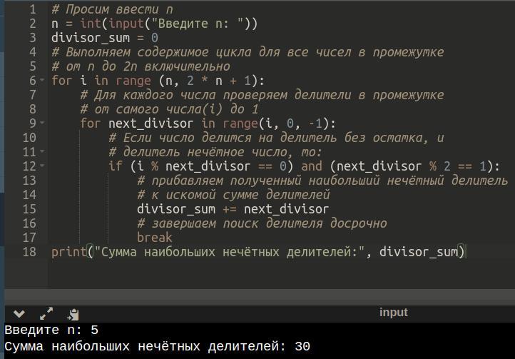 Найти сумму наибольших нечетных делителей каждого числа от n до 2n