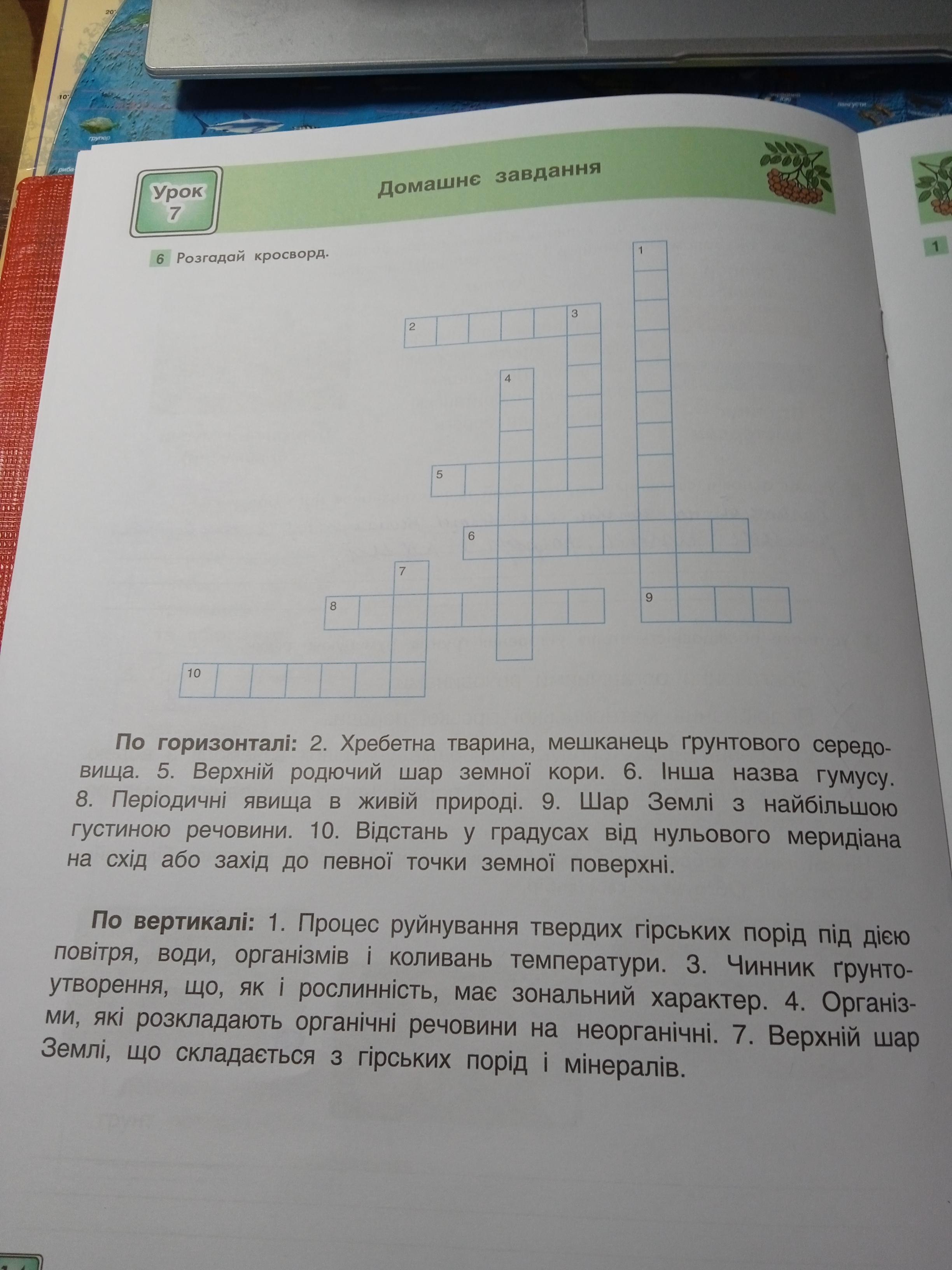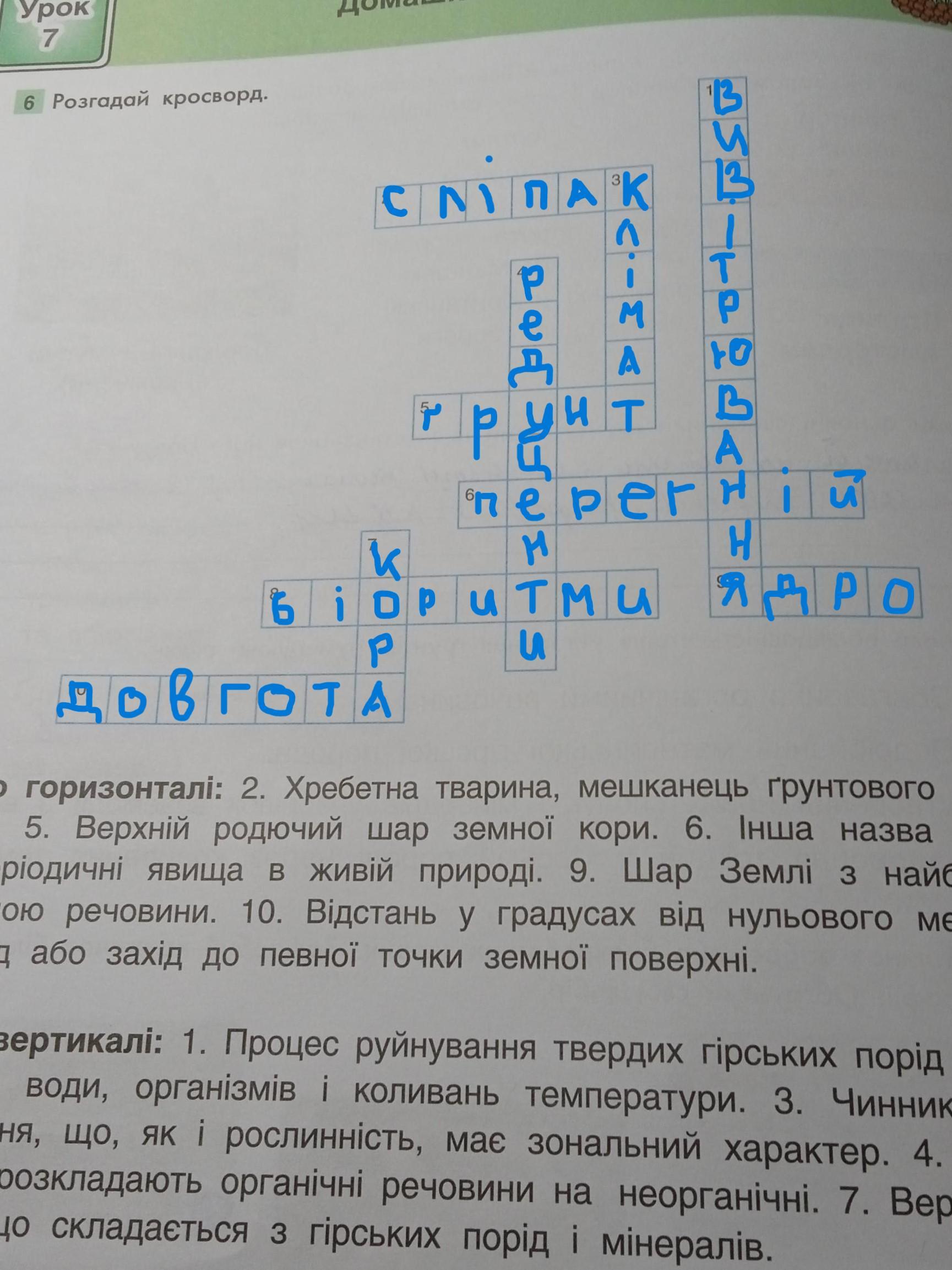 7. Верхній шар Землі, що складається з гірських порід і мінералів.(Кора).