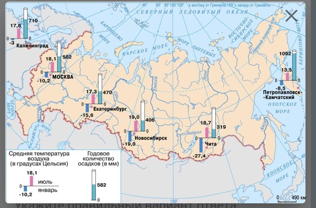 В каком из городов, указанных на карте, самая большая амплитуда температур воздуха?
