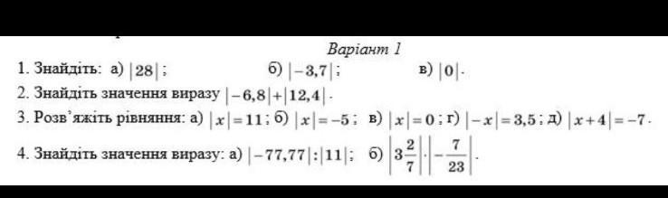 2. Знайдіть значення виразу |-6,8|+/12,4|- 3. Розв'яжіть рiвняння: а) x=11:6) |x|=-5; в) |x|=0; г) |-x|=3,5; д) |x+4|= -7. 7