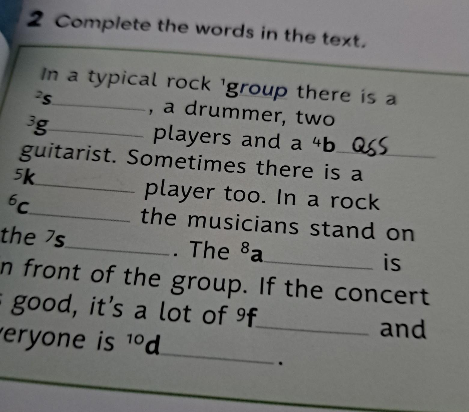 rd 2 Complete the words in the text. In a typical rock 'group there is a a drummer, two 25 " 3g guitarist. players and a 4b QSS Sometimes there is a player too. In a rock the musicians stand on The Ba is 5k 6℃ the 7s in front of the group. If the concert and is good, it's a lot of of everyone is 10d In pairs, use thes
