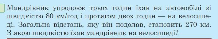 Мандрiвник упродовж трьох годин їхав на автомобілі зі швидкістю 80 км/год і протягом двох годин - на велосипе- ді. Загальна відстань, яку він подолав, становить 270 км. З якою швидкістю їхав мандрівник на велосипеді?