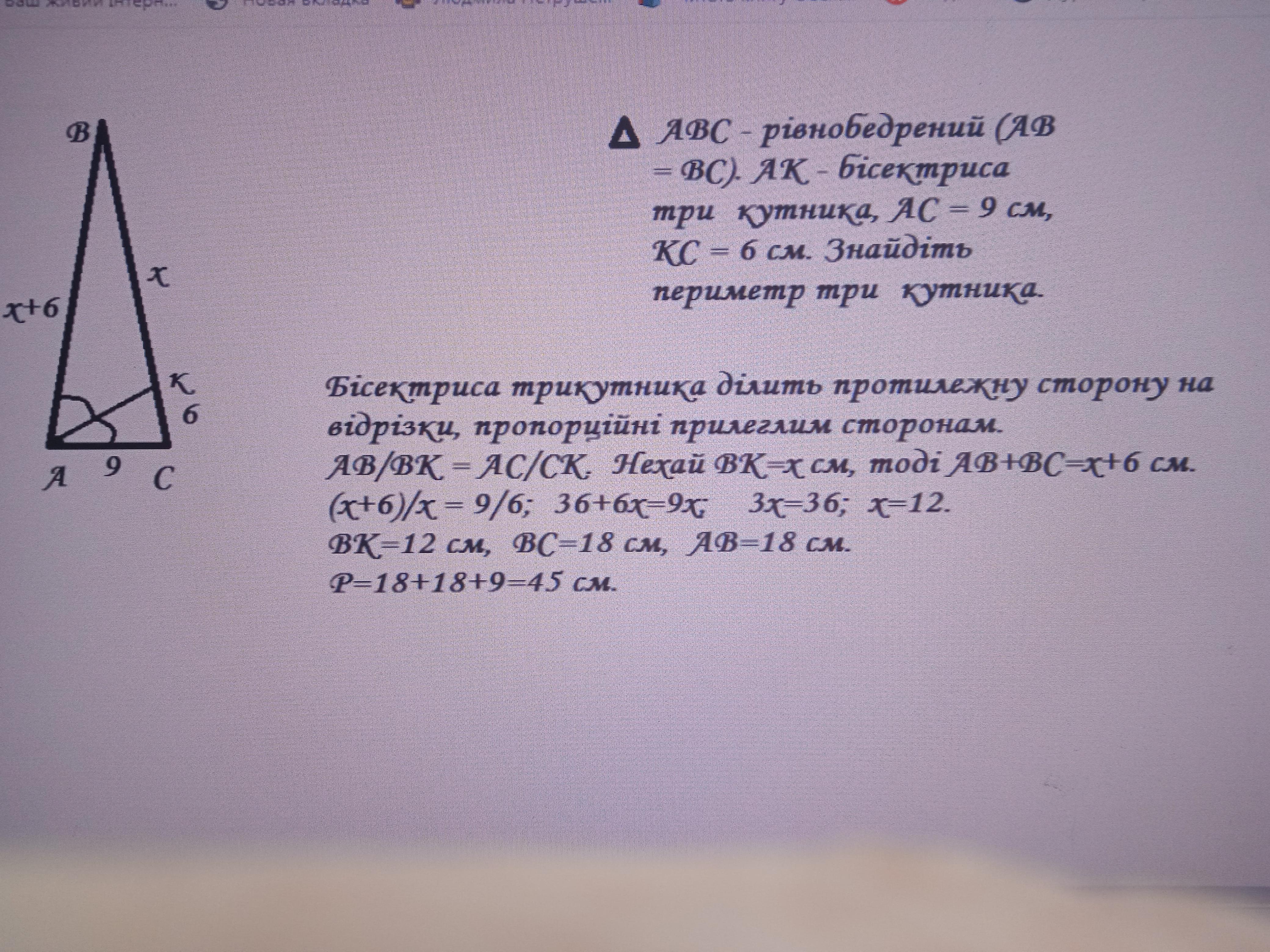 трикутник АВС - рівнобедрений (AB = ВС). АК - бісектриса три- кутника, АС = 9 см, КС = 6 см. Знайдіть периметр три- кутника.