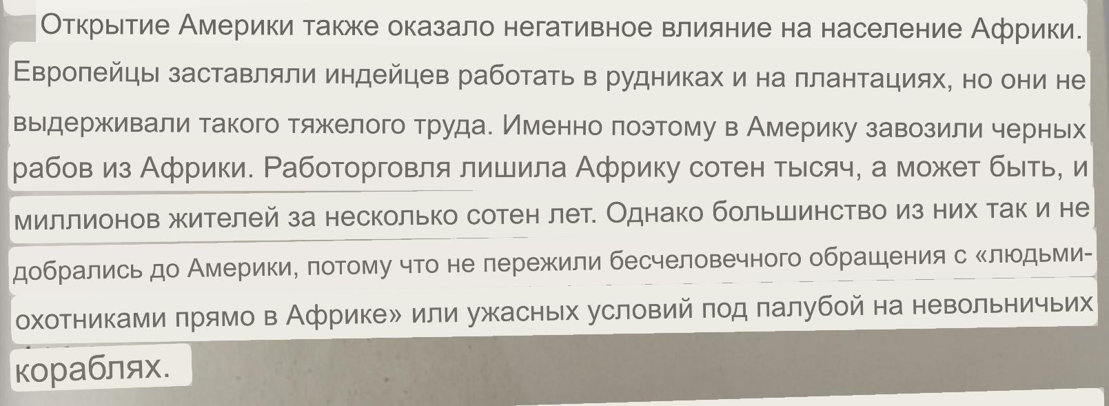 возможно речь идёт о том что европейцы для тяжёлого труда в Америке завозили чёрных рабов из Африки. Работорговля лишила Африку большого количества людей. Поэтому открытие Америки негативно повлияло на Африку.